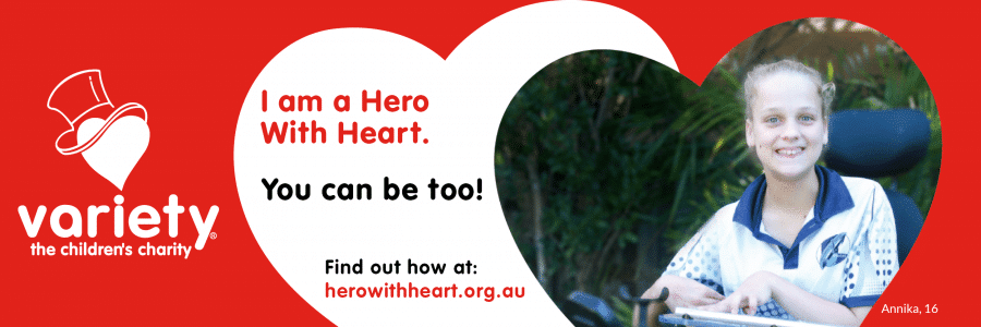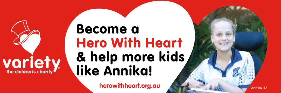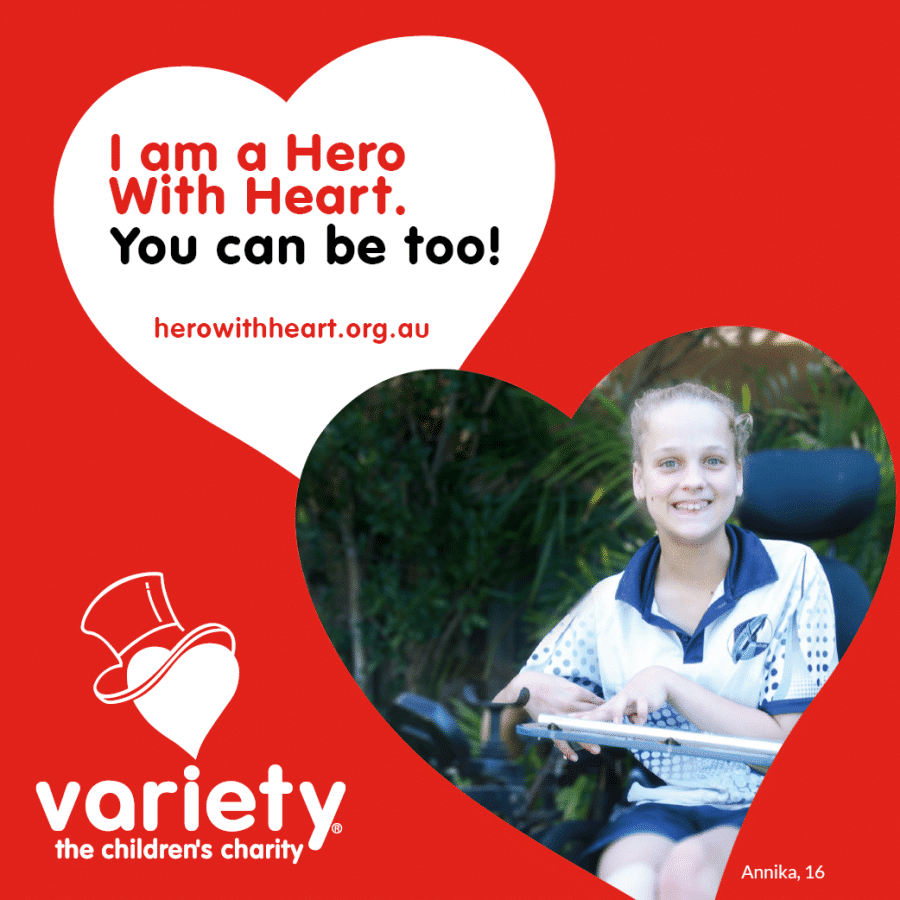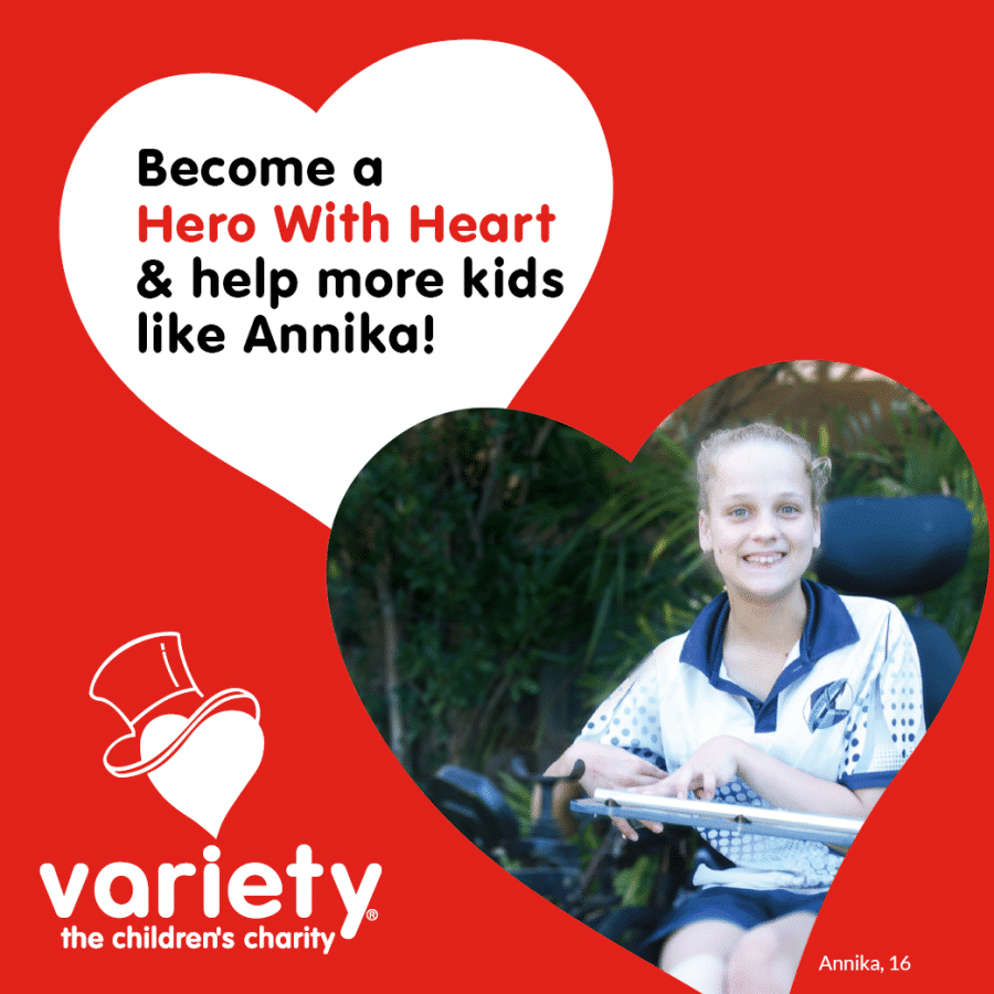 “Become a Hero With Heart and help make life better for more Aussie kids like Annika. You’ll join me as part of the Variety family on an inspiring journey, making a real difference by empowering children who are sick, disadvantaged or have special needs, to reach their full potential!