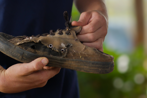 Tom had been using a worn-out pair of converse shoes. Even after his foot poked through his shoes mid-game, Tom improvised with zip ties to continue playing.